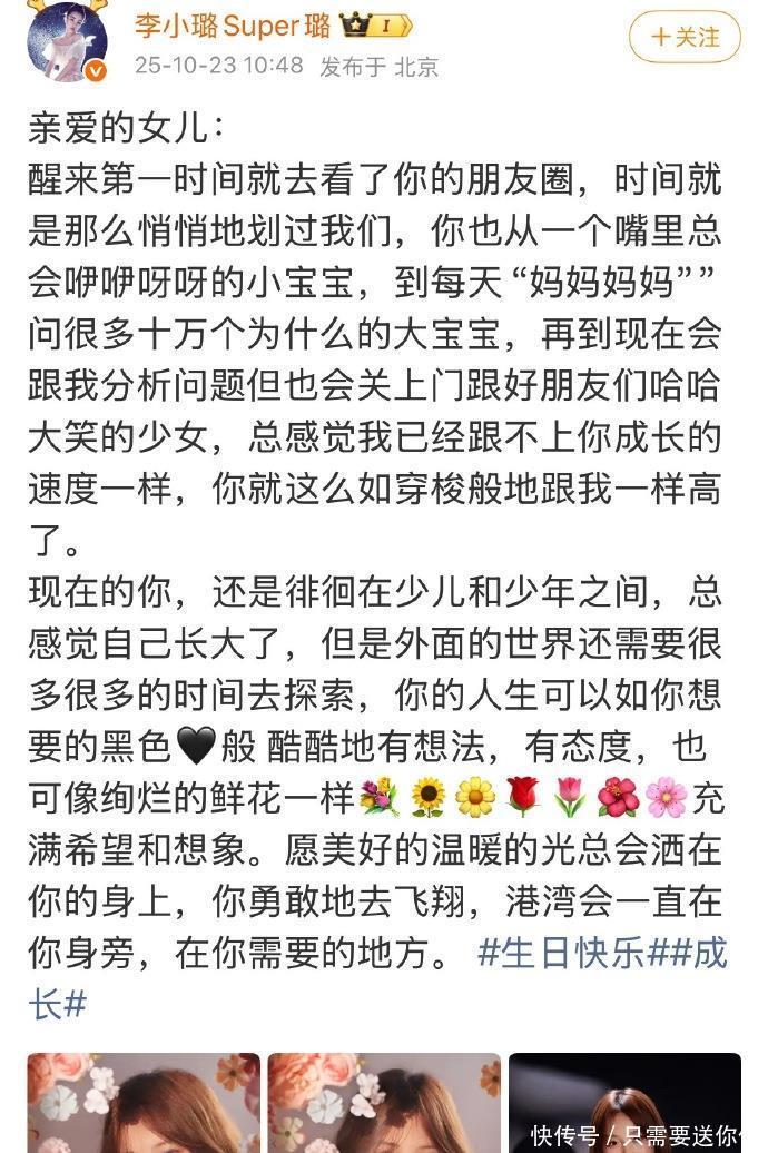 同日,母亲李小璐也在朋友圈发布长文,深情回顾甜馨从“咿呀学语到独立思考的少女”的成长历程,并寄语女儿“勇敢飞翔,港湾永在”。尽管二人未曾公开同框,但这种不约而同的祝福,被公众解读为“离婚不离爱”的成熟默契。如岁的甜馨,已与妈妈李小璐齐肩,当年在综艺中金句频出“我们白着呢”的小女孩,已然蜕变为亭亭玉立的少女。